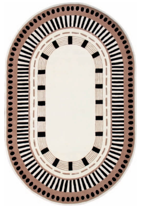 Roma Ivory сочетает современный графичный дизайн с мягкой цветовой палитрой. Овальная форма и ритмичные линии в оттенках айвори, чёрного и бежевого создают эффект динамики и гармонии. Этот ковёр станет выразительным акцентом в интерьере, сохранив при этом баланс и уют. Выполненный вручную из натуральных материалов, он отличается высоким качеством и приятной текстурой.